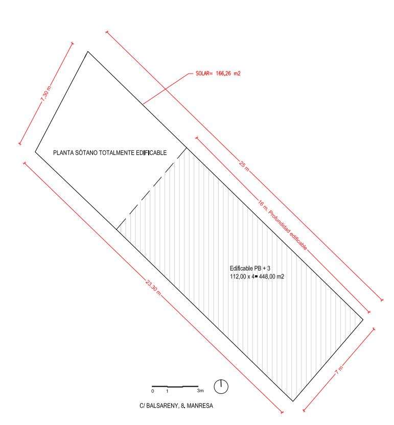 * El Inmueble se encuentra gravado con una carga que no afecta a la transmisión del Inmueble. El Inmueble se encuentra gravado con la incoación del expediente administrativo de orden de ejecución a un tercero. El Comprador asumirá; (i) la carga con las que se encuentra gravado el Inmueble, con plena indemnidad para la Vendedora; y (ii) El Adquirente asumirá cualquier coste y gasto derivado de la cancelación de la carga anterior, llevando a cabo cuantos tramites sean necesarios para ello, si la misma fuese cancelable.* Suelo en el término municipal en la calle Balsareny, número ocho, de Manresa, Barcelona. Tiene una superficie aproximada de ciento sesenta y seis metros veintiséis decímetros cuadrados.
