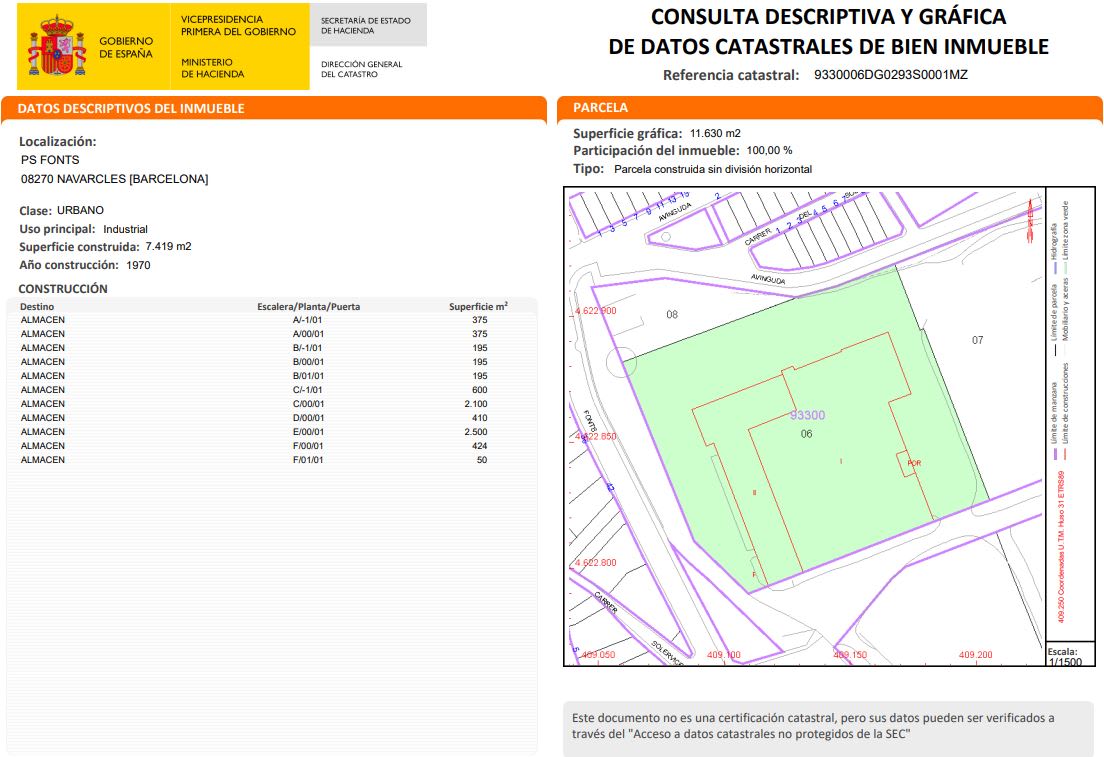 El terreno urbano en cuestión se extiende por una superficie de 11,630 metros cuadrados y se sitúa en Navarcles, Barcelona. La ubicación goza de una notable cercanía a múltiples servicios y establecimientos. En un radio de 400 metros se encuentran 10 restaurantes, con el más cercano a solo 100 metros. En cuanto a facilidades de aparcamiento, hay hasta 13 zonas disponibles en un radio de 2 kilómetros, siendo el aparcamiento más próximo a 300 metros. La proximidad a infraestructuras educativas y recreativas es otro punto a considerar, hallándose cerca del Pavelló Municipal de Navarcles y de la Llar d’Infants Les Oliveres. El terreno también destaca por su cercanía a varios centros médicos, incluidos el Centre Mèdic Navarcles a 400 metros. En las inmediaciones, se pueden encontrar múltiples parques y jardines, el más cercano a solo 80 metros, junto con una parada de autobús a 2 minutos a pie. Para actividades deportivas, el gimnasio más próximo está a 2 kilómetros de distancia. El terreno está destinado para uso industrial y se encuentra en una zona céntrica del municipio.