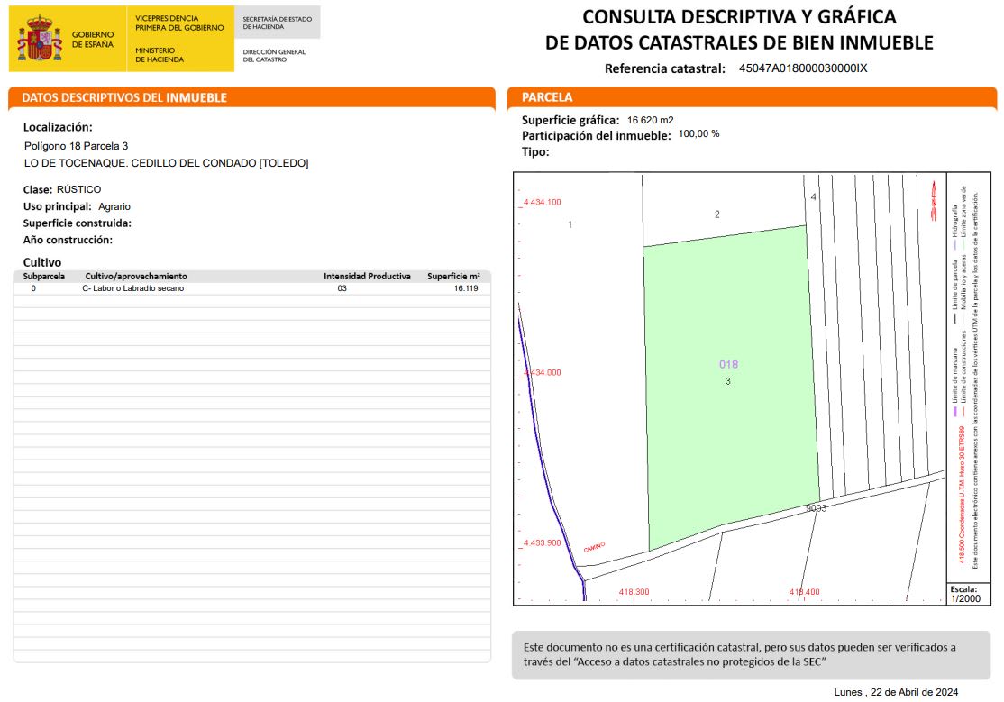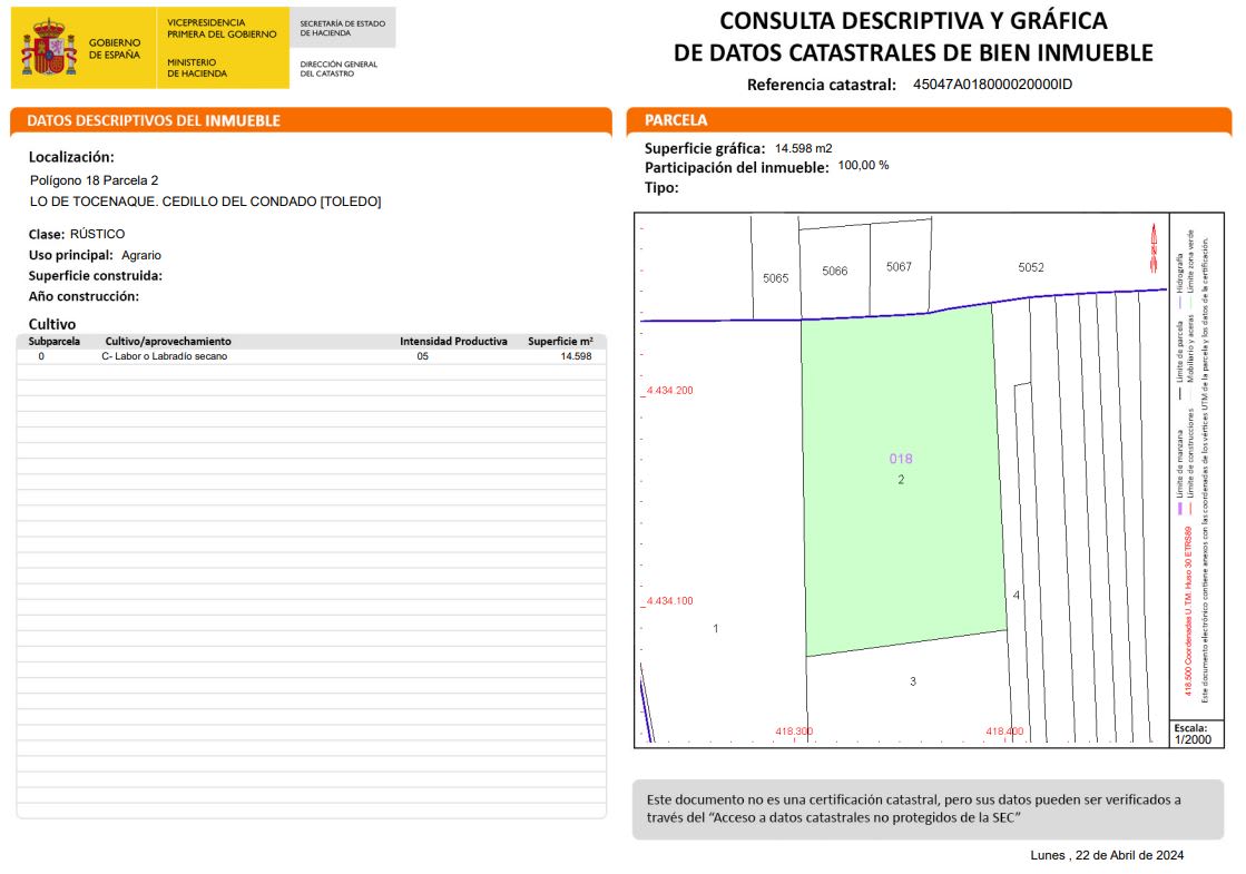 El inmueble es un suelo rústico situado en Cedillo del Condado, Toledo, con una extensión total de 30,717.0 m². Dentro de esta superficie, se encuentra una parcela destinada a uso agrario que abarca 14,598.0 m². El terreno es apto para actividades relacionadas con la agricultura.