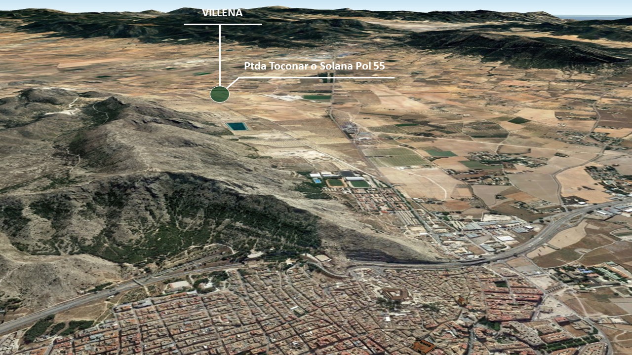 Suelo rústico no urbanizable de uso agrario o residencial. Está formado por tres parcelas, con una superficie total de 14907 m² y una edificabilidad total de 299 m²t localizado a las afueras de Villena, en la Partida Toconar o Sonala, muy próximos a la CV-799.