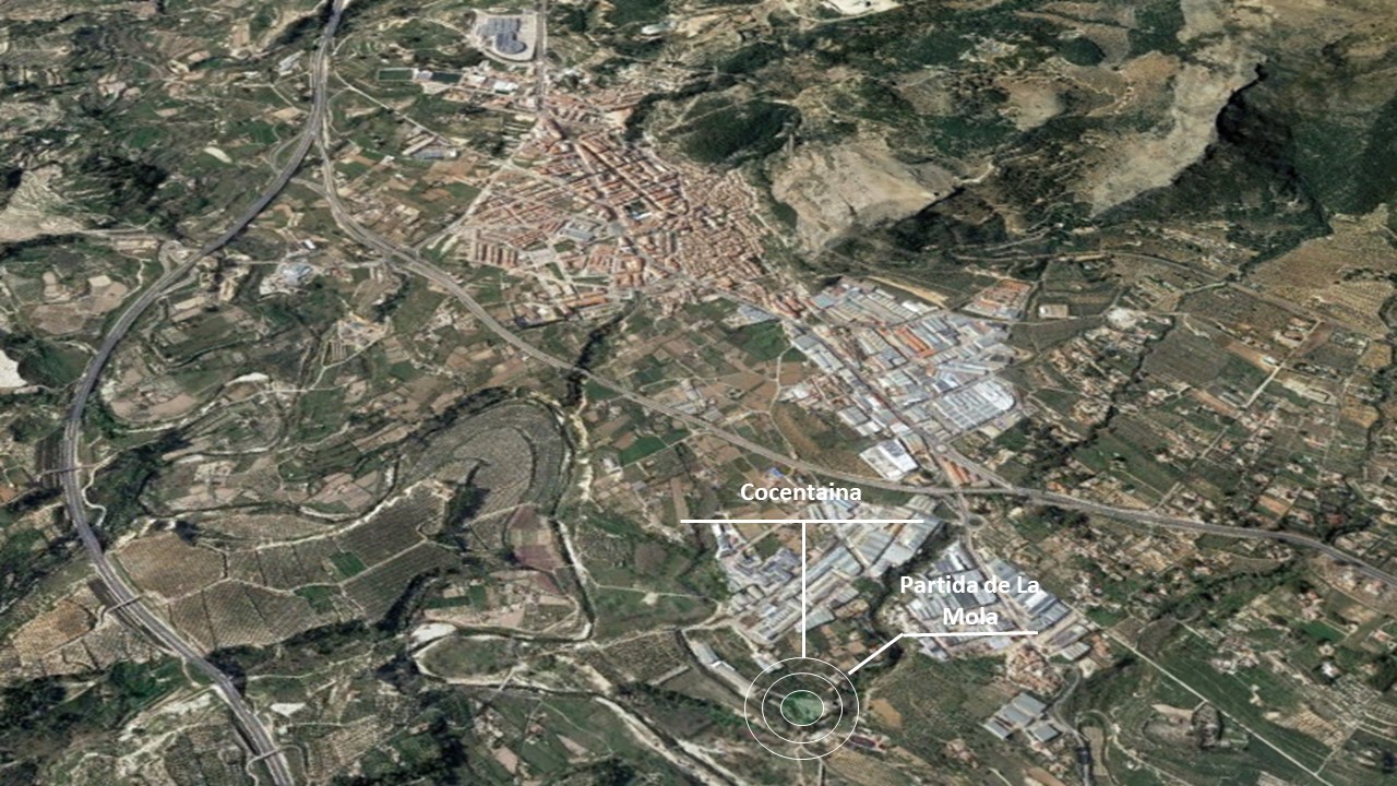 Situado en la Partida Alcudia, se encuentra en el margen este del Polígono Industrial Les Jovades, cerca del río Serpis, al noreste del núcleo urbano, a unos 3 km de distancia y en una zona topográficamente elevada. Cuenta con buen acceso a través de la carretera nacional N-340, que comunica con localidades cercanas como Alcoy. Sobre la parcela existía un complejo industrial, ya demolido en su totalidad.